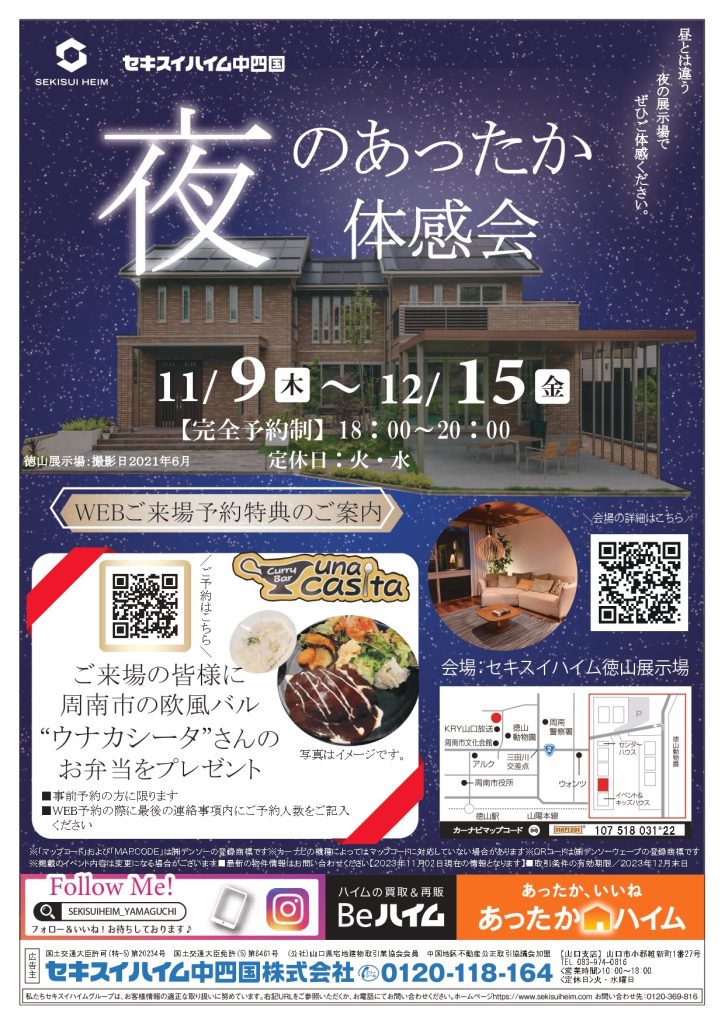 イベント 【セキスイハイム】ウナカシータお弁当付⭐︎夜のあったか体感会開催中! 2023.11.26 Tweet Share Hatena Pocket RSS feedly Pin it この記事のタイトルとURLをコピーする お仕事帰りなど、いつもは体感できない夜のセキスイハイムを是非ご家族皆様でご体感ください⭐︎ 嬉しいお弁当付きです♪ 完全ご予約制ですのでこちらからご予約をお願いします ☟☟☟ 徳山展示場 Tweet Share Hatena Pocket RSS feedly Pin it 【エルクホームズ】12/2(土)・3(日)柳井市柳井にて完成見学会開催!※完全予約制 前の記事 【セキスイハイム】ご来場予約特典 次の記事